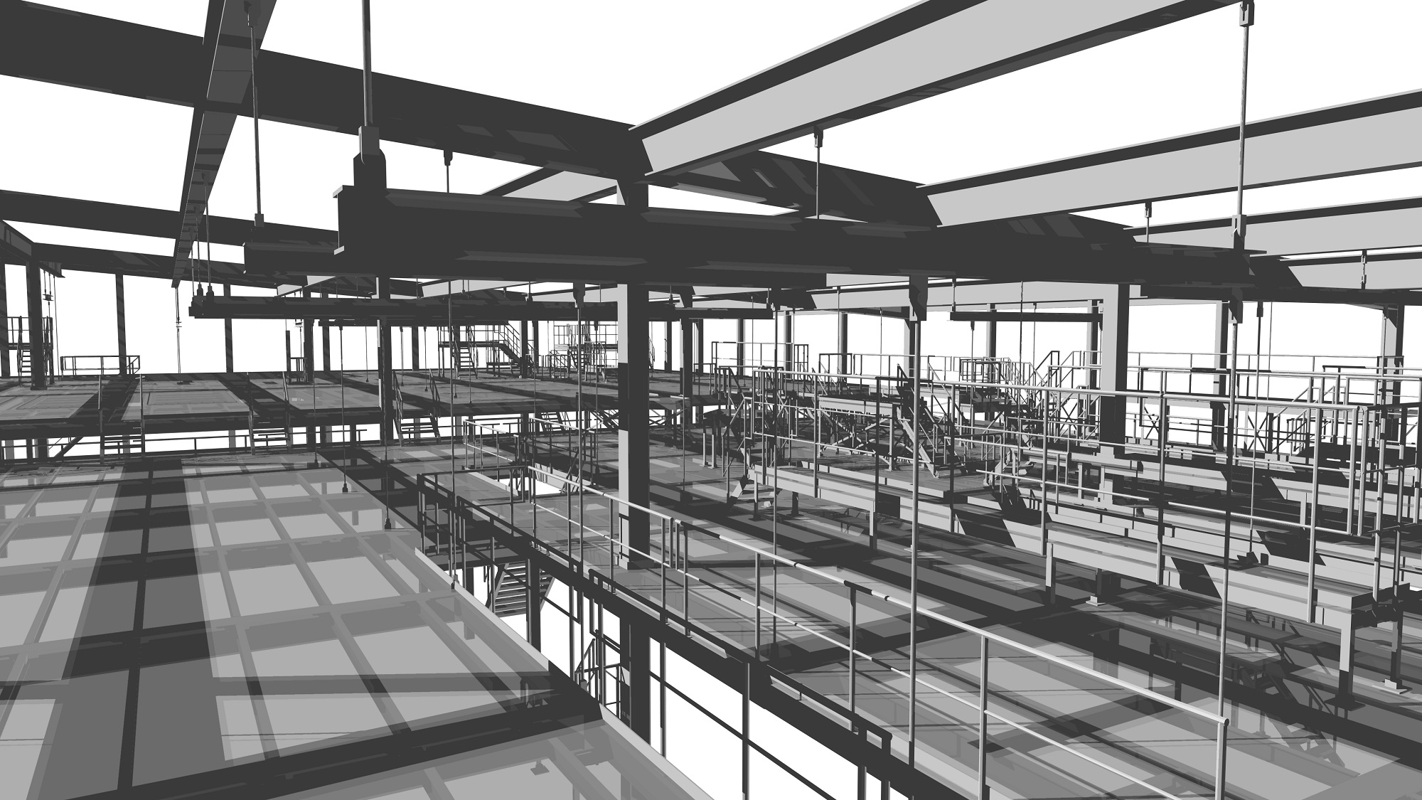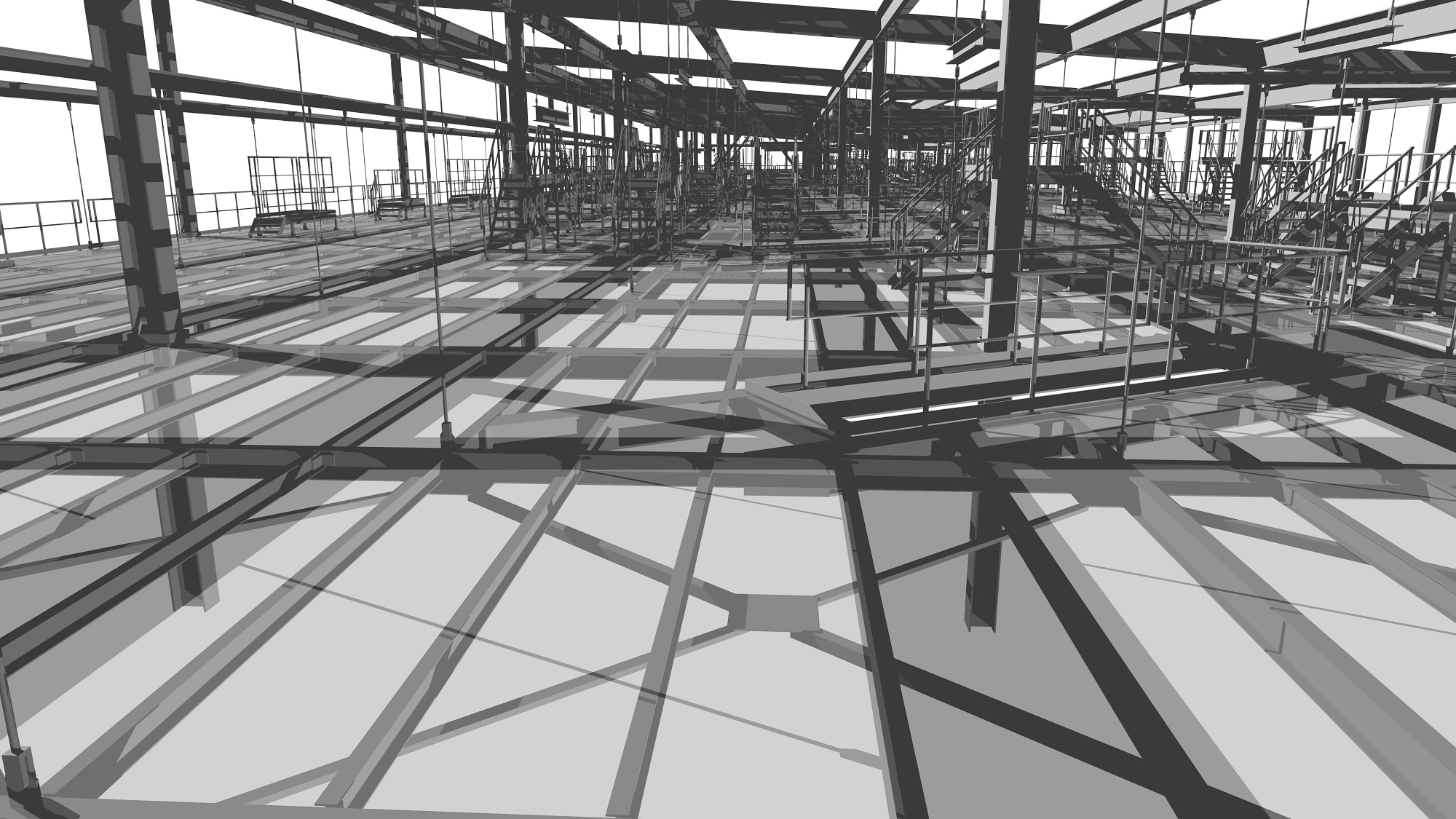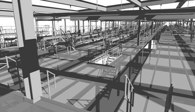 Due to the complexity of the conveyor layout, the relatively limited space available for the platform structure and the working practice of the client, the whole structure has been modeled in 3D for the structural analysis and drawings. This also led to the possibility to check the input of various disciplines to prevent 'clashes' of the platform structure with the baggage handling system, building structure, installations and spaces / envelopes reserved for transport vehicles.