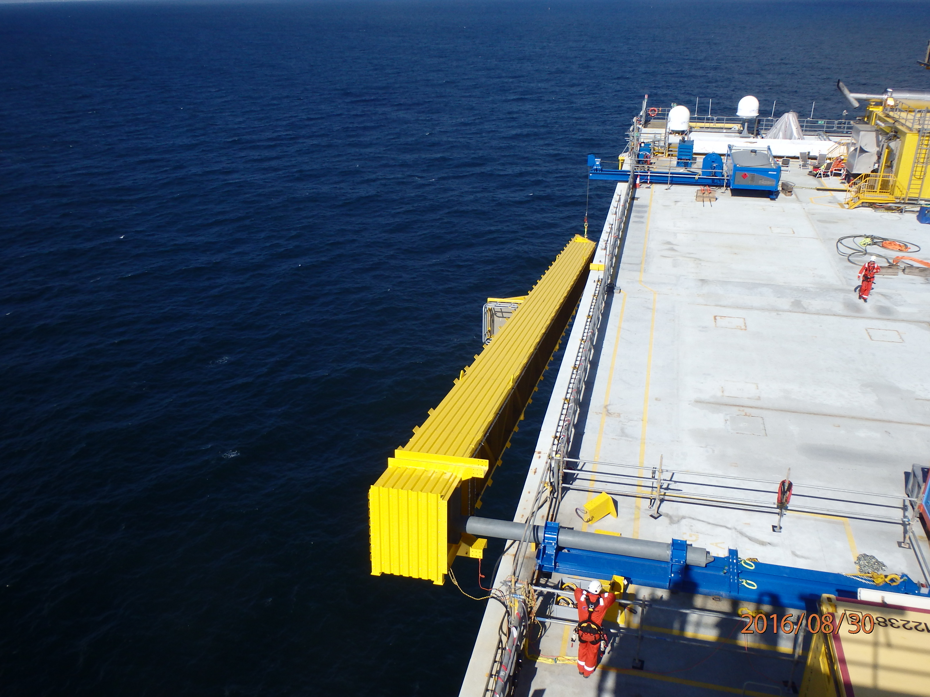 The main challenge was upending the riser. As the platform’s crane was inadequate to perform this task, we made use of the substation’s height to upend the riser. By first sliding it out of the platform and supporting it at one end with a hinge point and then lowering it at the other end with a winch, it was slowly brought into the vertical position.