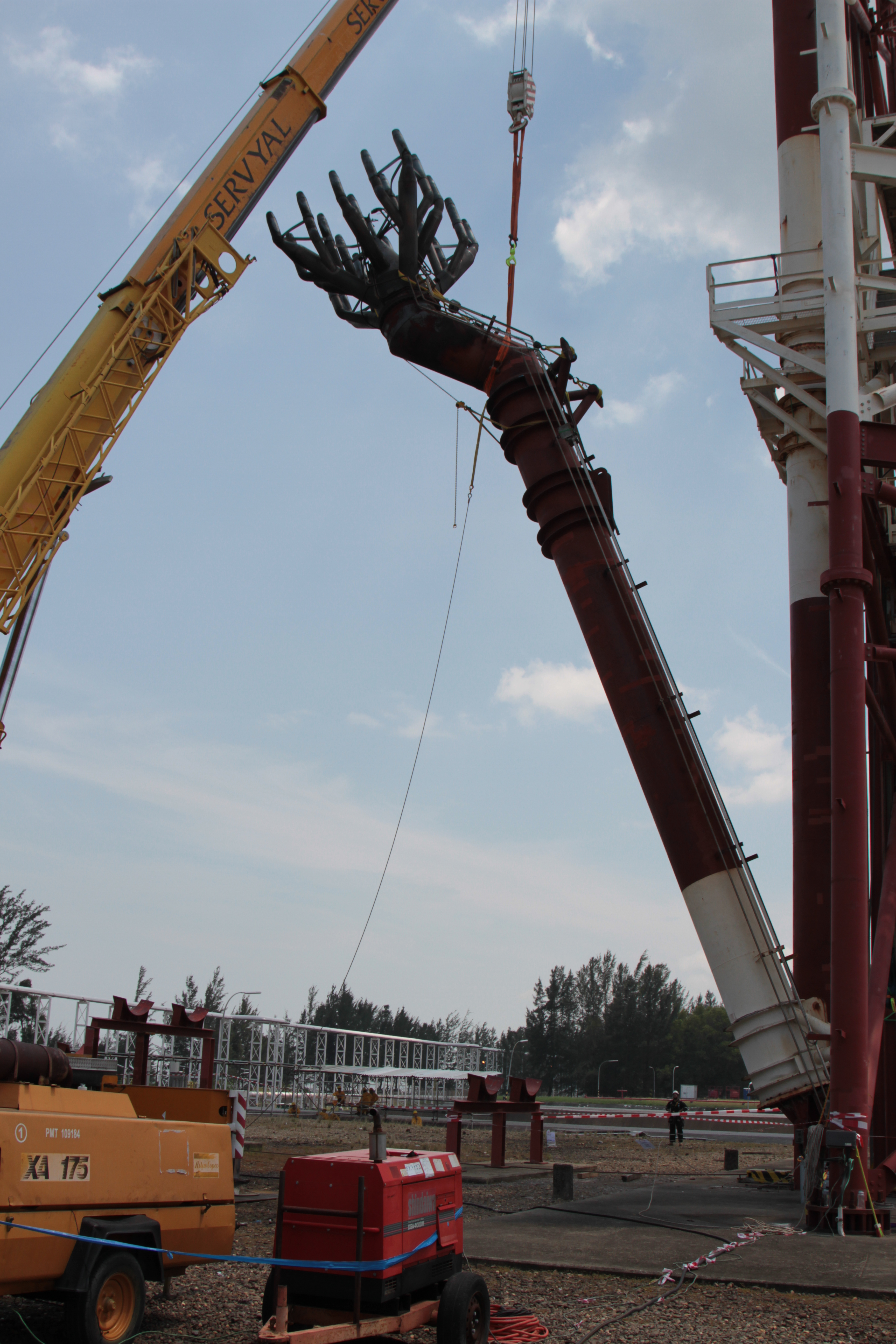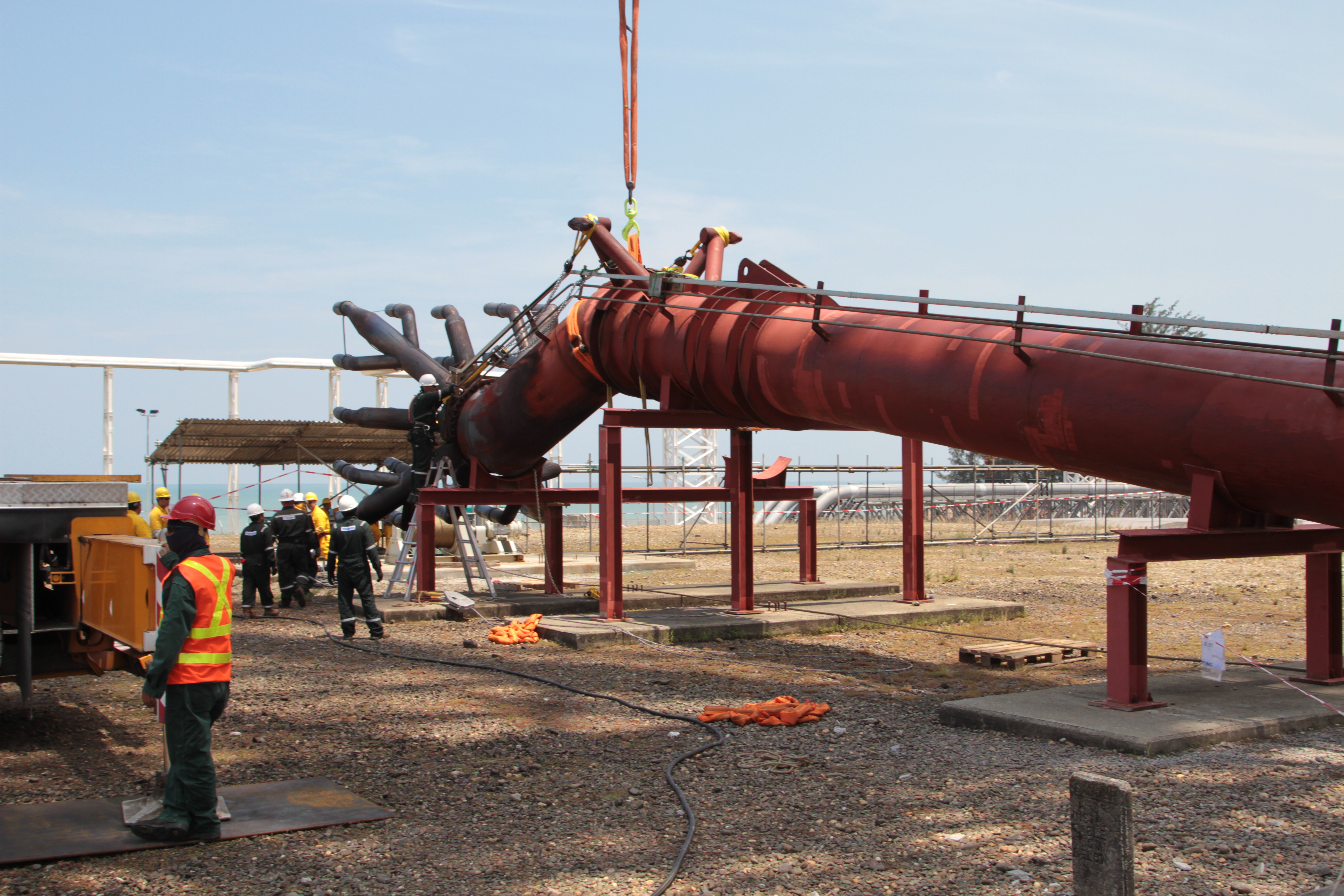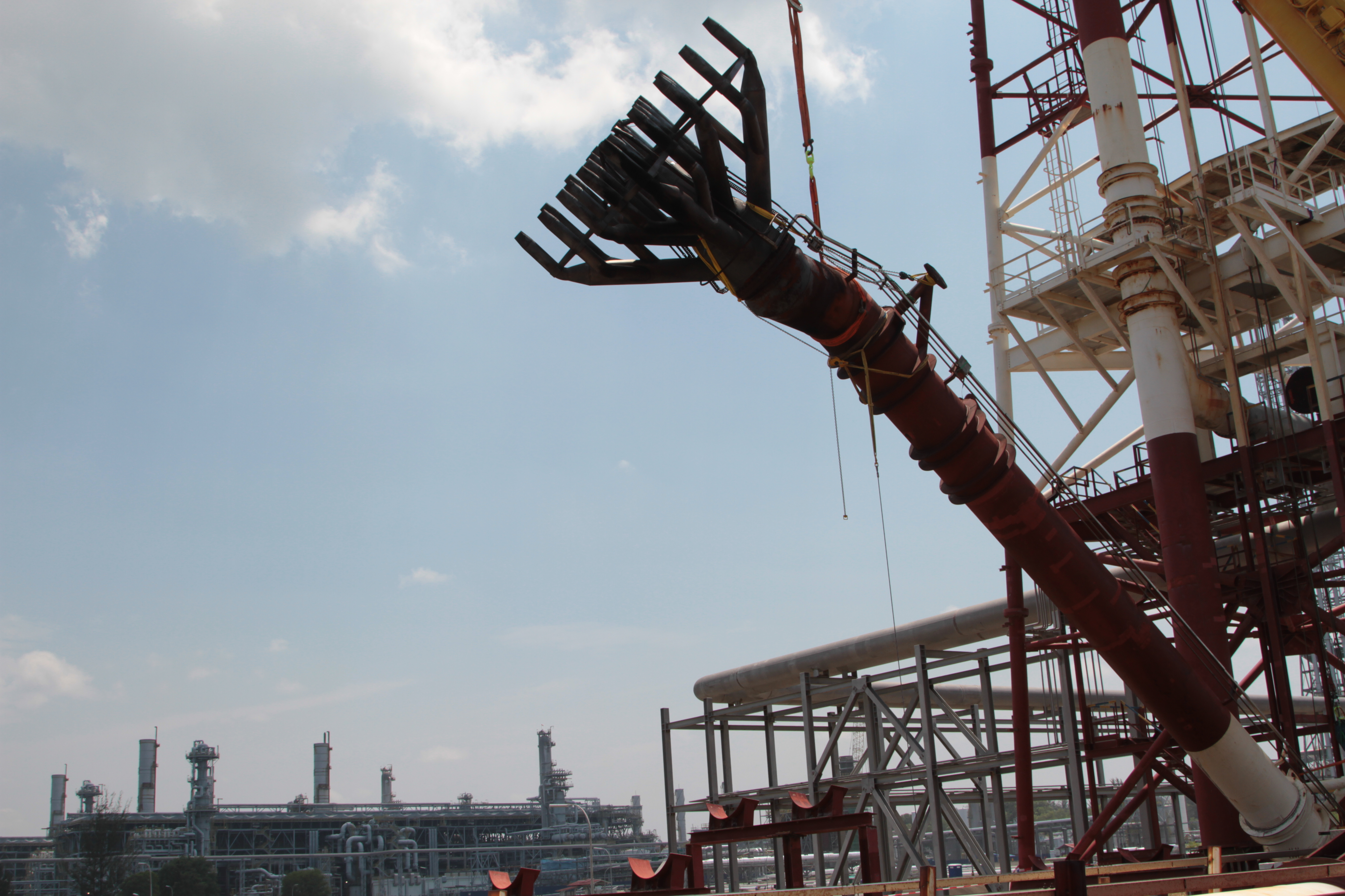 The Conbit team consisted of 8 technicians. The team included a supervisor, welders, onsite technicians and rope access technicians. Besides the general lifting equipment used for works in a retractable flare tower, the team was also equipped with a 50” bevel machine. This machine is rare in the industry, but proved to be a valuable tool during this project.