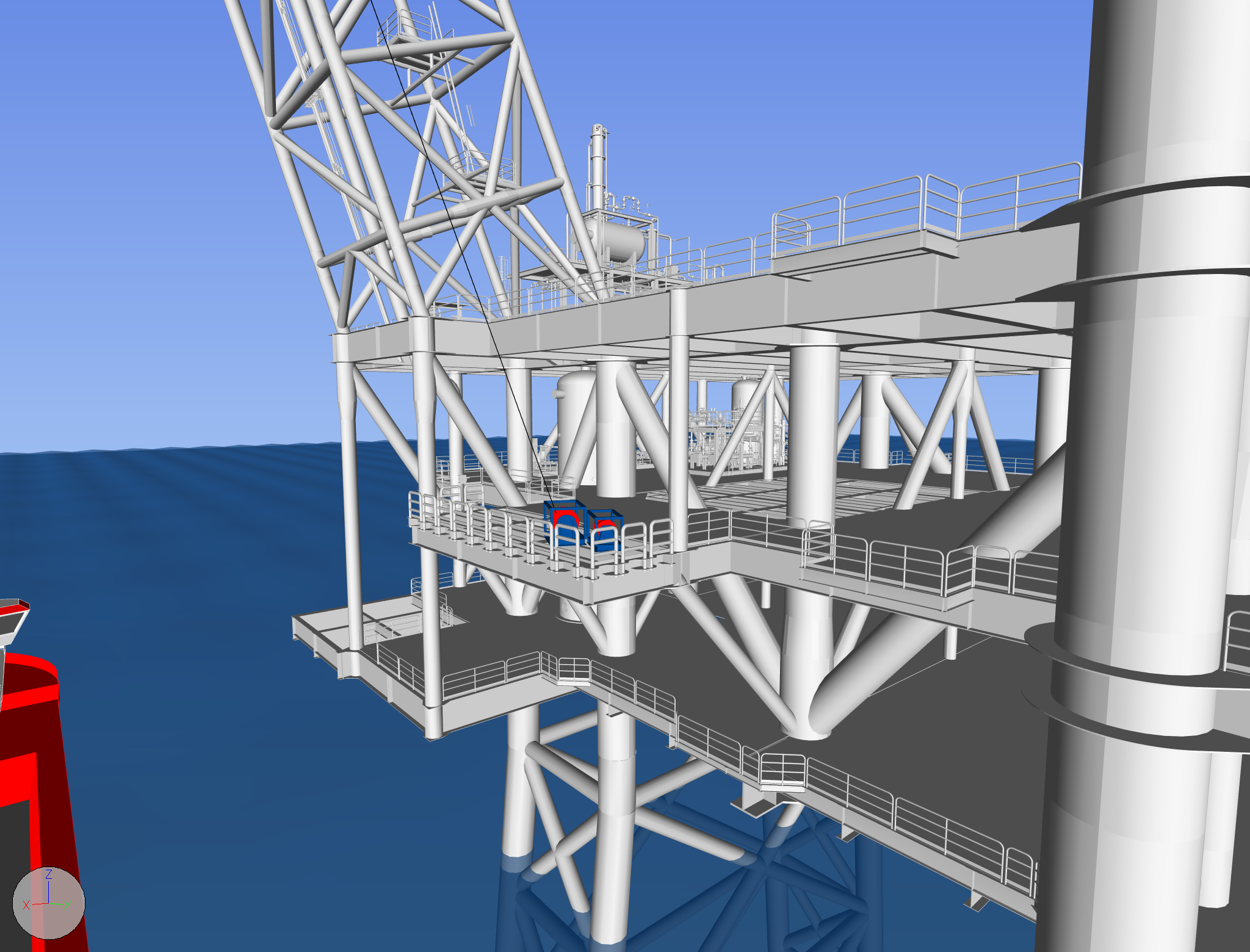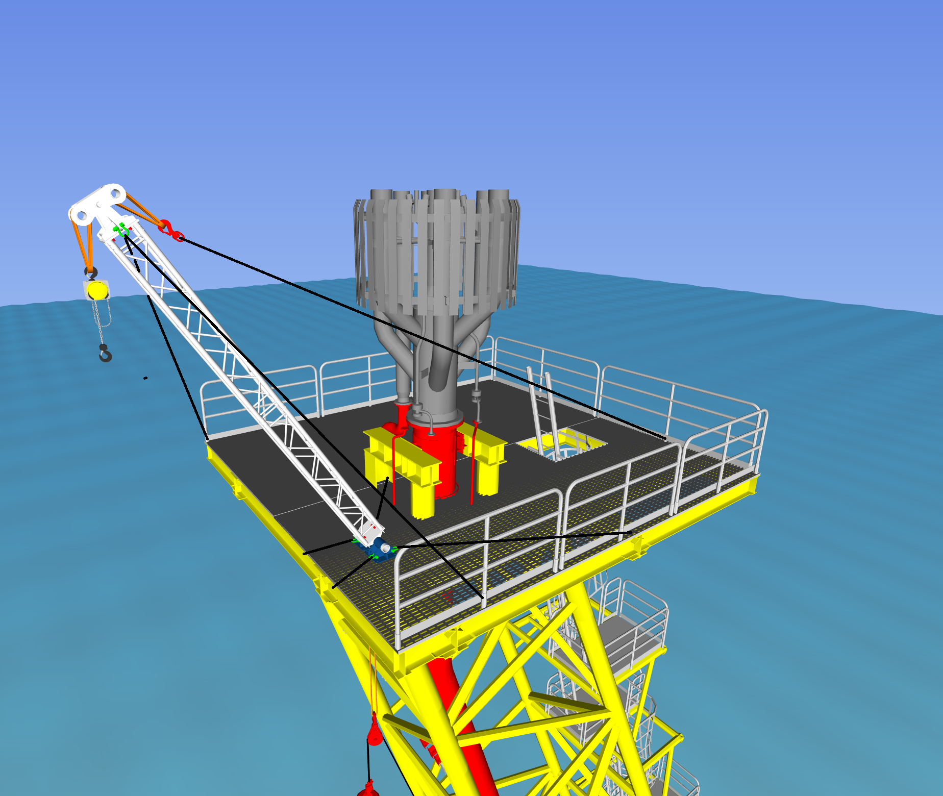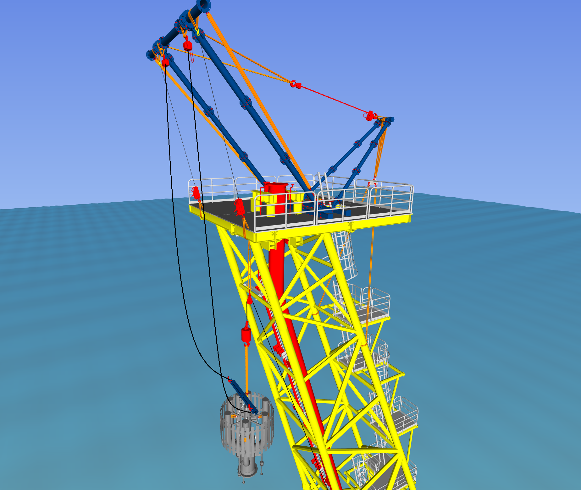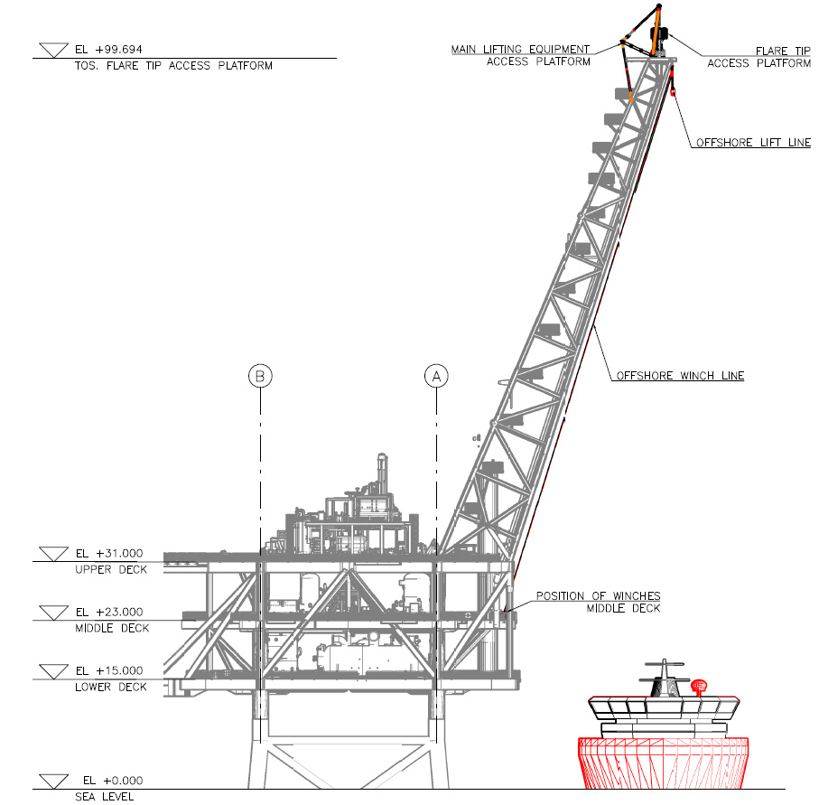 Conbit’s unique flare-tip replacement method is a mechanical solution, using Conbit’s modular handling equipment. Lifting winches are used in combination with lift frames or davit structures. For the SK316 flare-tip replacement, a gantry-type handling structure has been selected. By using lightweight aluminium components, the overall weight of the system has been kept as low as possible. The gantry will enable the rigging crew to lower the flare tip over the side of the flare-tip access platform. Once it is below the platform, high-speed winches will lift it directly onto a supply vessel.