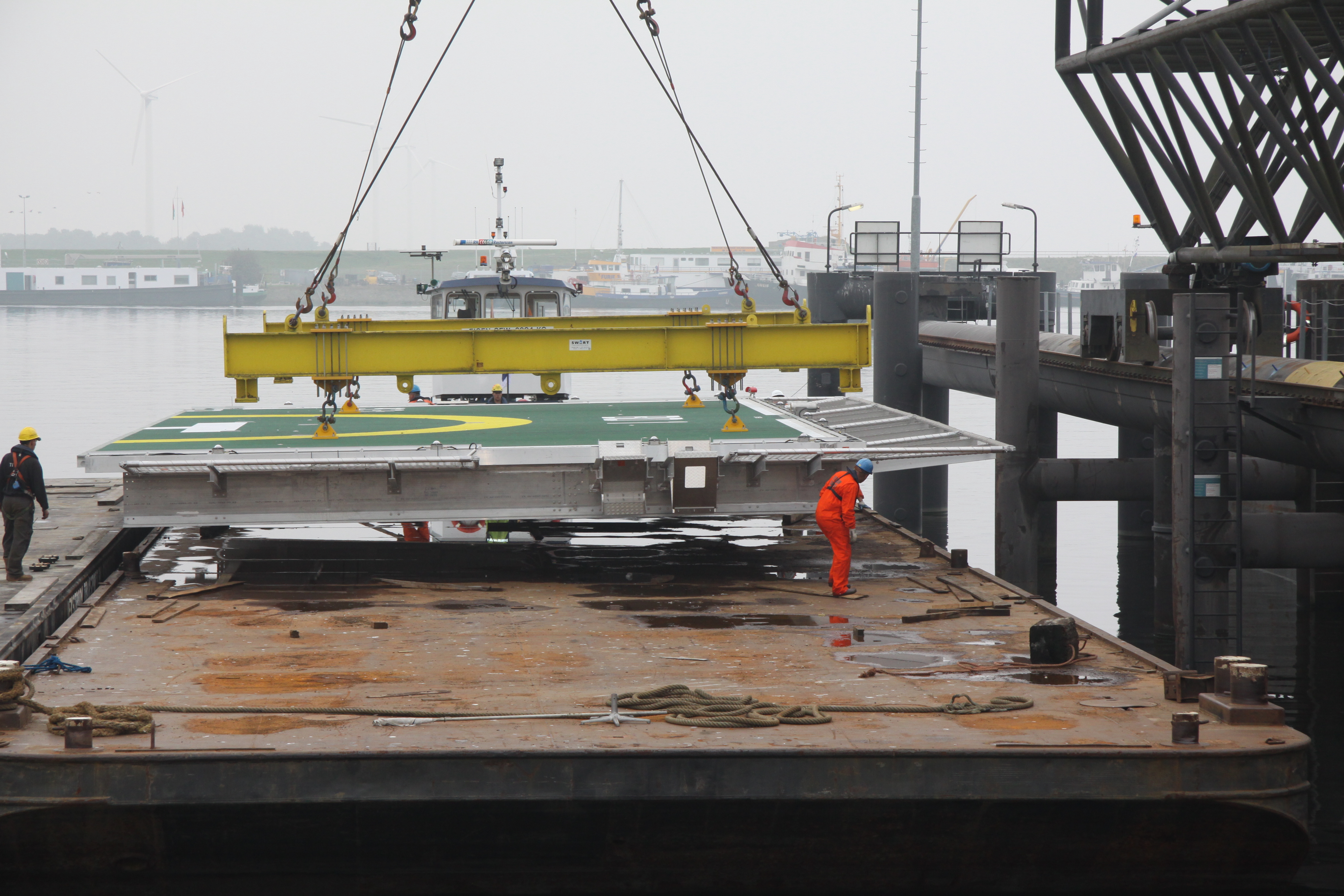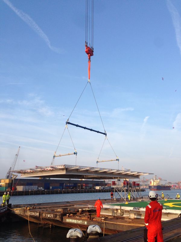 The helideck installation started with the assembly of the support frame. This frame would serve as the foundation of the helideck. On 1 November, the support frame was installed and the helideck pancakes were loaded. The pancake was supplied in two halves; two halves are easier to transport and one half was already nearing the maximum capacity of the deck crane of the BD-1 platform. The following day, the ASSO 31 transported the north pancake half offshore. During the journey, Conbit performed a load test on the deck crane. When the ASSO 31 arrived, the pancake half was lifted directly from the supply vessel onto the support frame. Two days later, the same process was repeated for the other helideck half.