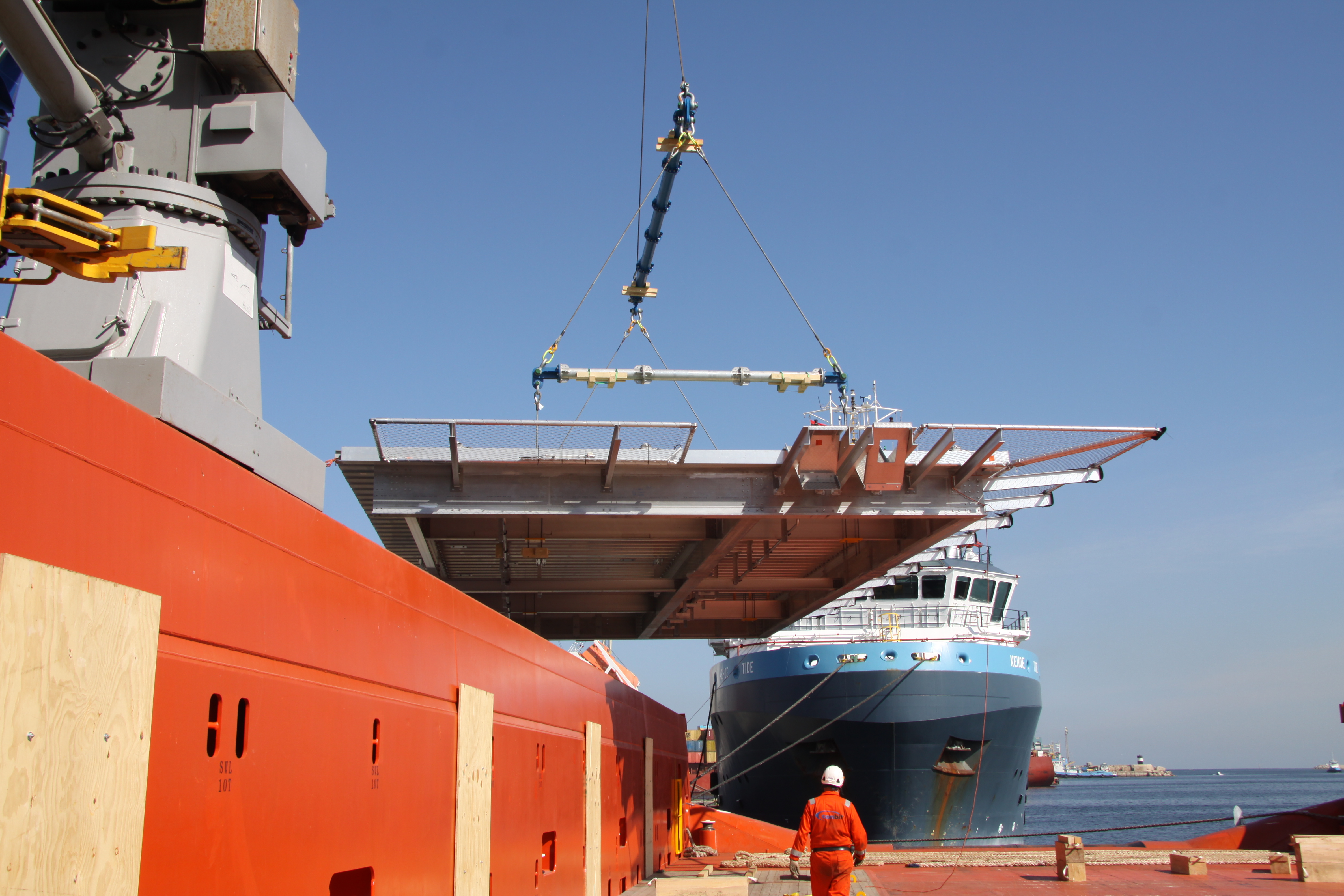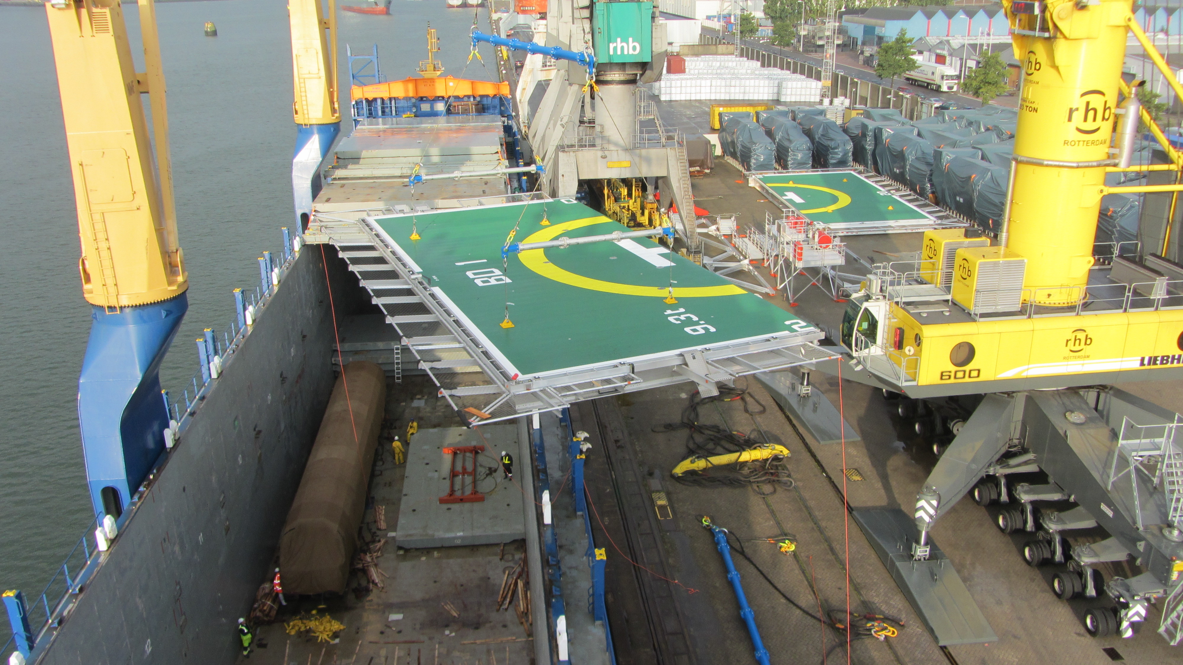 The complete helideck and support frame had to be skidded into its final position, as the deck crane was unable to lift the pancake halves at this location. After the skidding, the work was completed.
