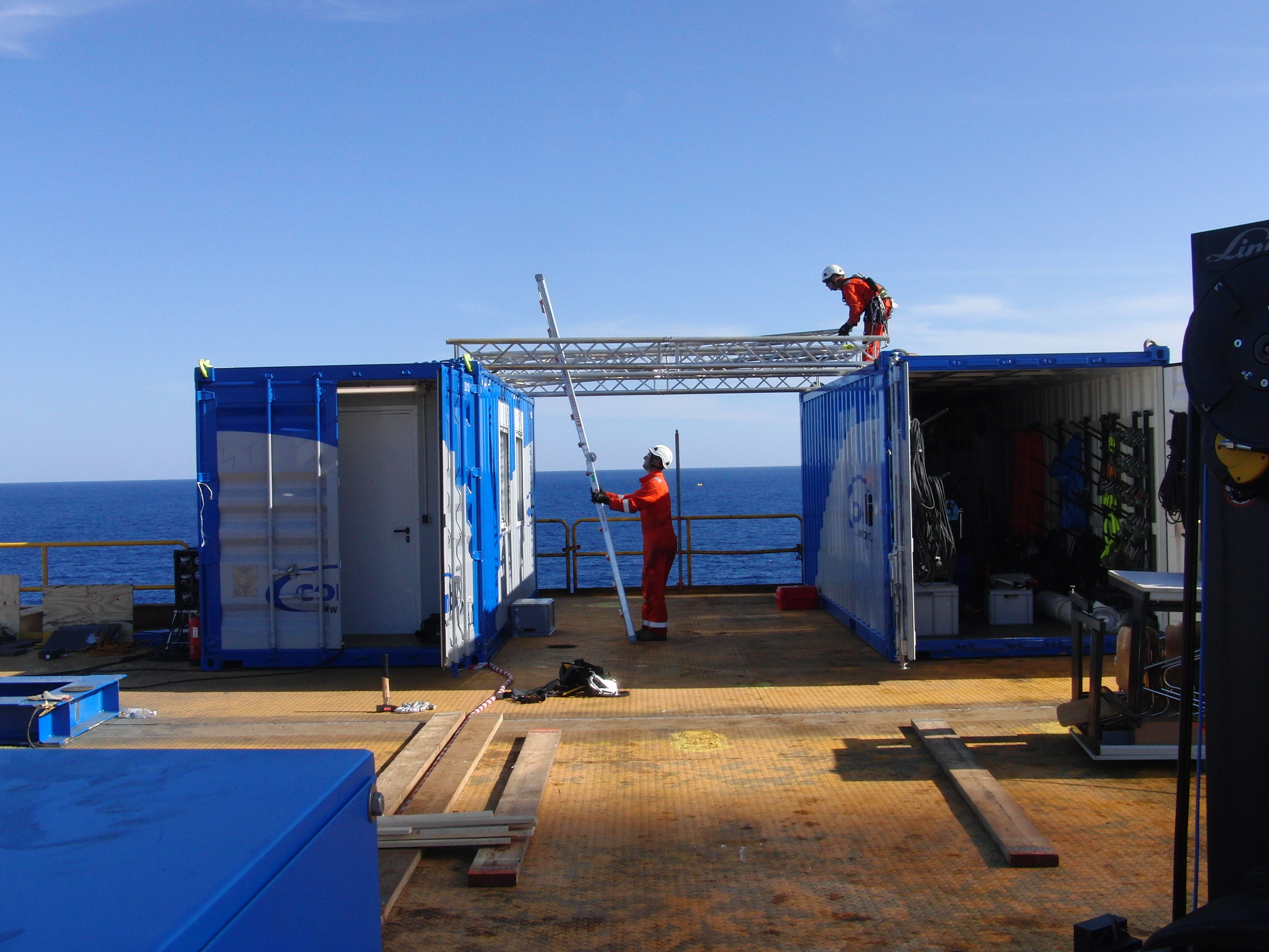 A couple of days before the arrival of the emergency shelter and helideck in Tripoli, the second crew travelled to the BD-1. At the same time, half of the construction equipment was transported in offshore containers via Italy directly to the offshore location on the ASSO 31 supply vessel. This supply vessel had been rented by Mabruk for the duration of the project. The customs authority and a Conbit representative were present on the platform when this shipment arrived and the necessary formalities were completed. The second shipment of construction equipment would arrive a week later on the platform.