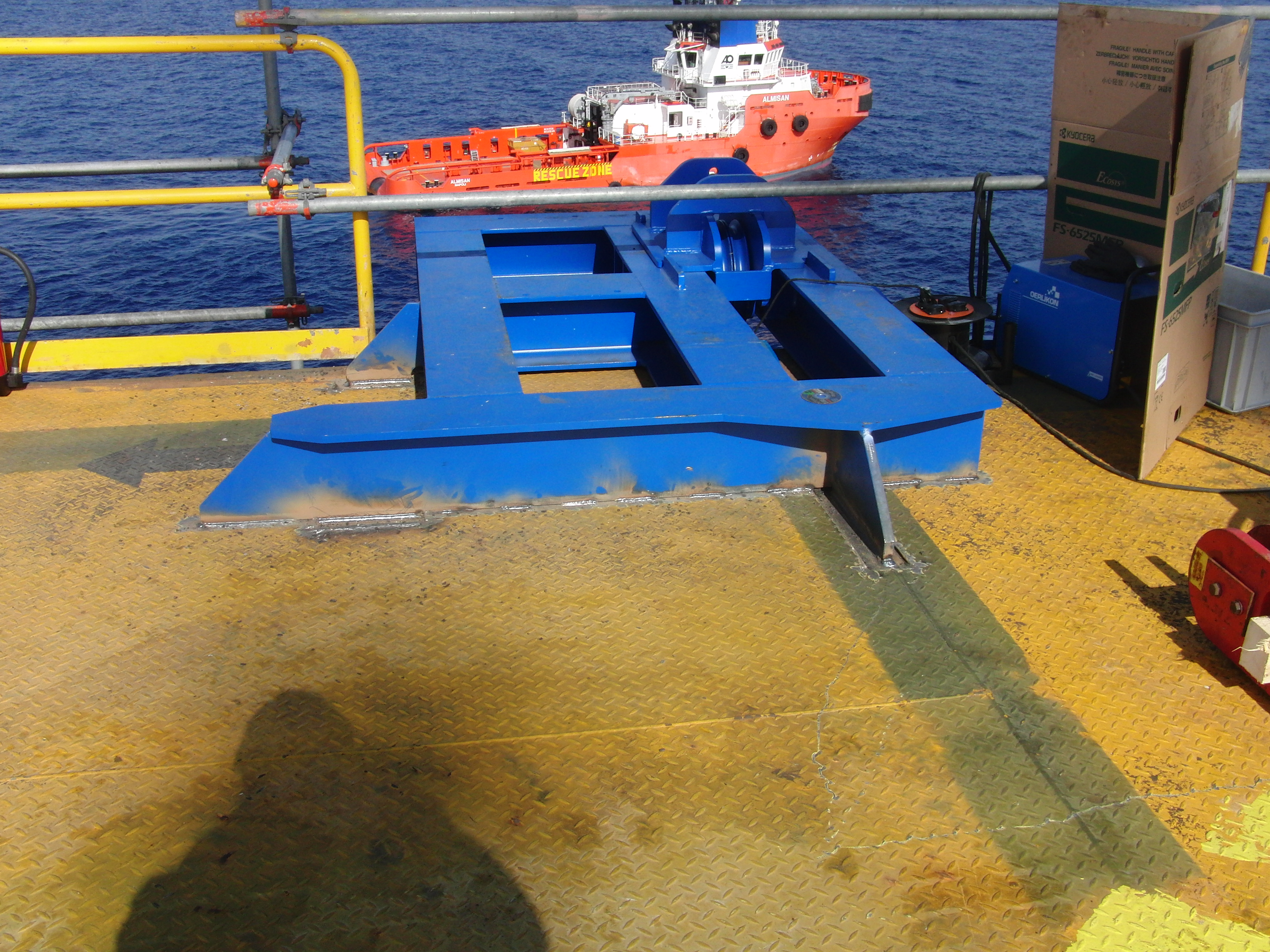 Immediately after the second crew arrived at the platform, the preparation works started. Scaffolding technicians started to place overboard scaffolding and perform the first welding activities. At the end of the first week on board, the crew managed to install all the winch, sheave and jacking frames and complete most of the preparatory welding. One week of further preparations was required before the emergency shelter could be lifted. During these activities, a small forklift brought onsite by Conbit proved very useful. This was equipped with a small lift boom and fitted into a 20” offshore container.